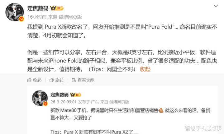 据博主爆料,华为Pura X新款将改名,不叫Pura X2,而且去年Pura X的内屏是6.3英寸16:10,外屏是3.5英寸1:1。
